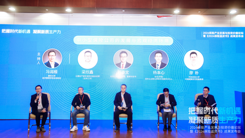 圆桌论坛主持人清华大学中国保险与风险管理研究中心主任冯润桓教授与众惠财产相互保险社副总经理梁欣鑫先生,北京人寿副总经理、董事会秘书刘睿文先生,安永中国保险业战略与转型咨询服务合伙人杨本心先生,永利集团官网中国精算研究院副教授廖朴先生四位嘉宾,围绕中小型保险公司的发展与宏观经济环境这一主题,从宏观经济的趋势、行业发展趋势、公司战略定位、风险管理与创新等多个维度进行深入的探讨。