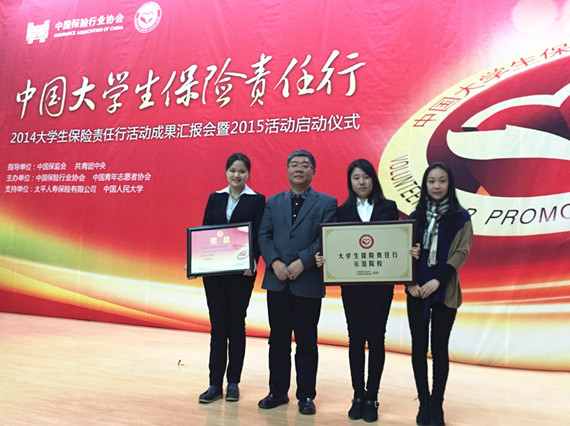 公司作为首批“中国老员工保险责任行”示范院校,受主办方邀请,代表全国各地22所高校做了主题为“鹰仕(保险英文单词insurance的前三个字母INS的音译)力量”的活动成果汇报。本着“保障苍生万物,精算天下财富,保险固国安邦”的宗旨,2014年公司保险学子参与了8场高端论坛讲座,共计21人次出席国际学术会议,发表论文70余篇;组建9支实习实践团队,历时169个日夜,横跨1000余公里,走进校园、社区、企业、农村开展了志愿宣讲、市场调研、社会实践、专业实习等多种活动,体现出保险学子勤学于思(Intelligent)、敏捷于行(Nimble)、至善于德(Selfless)的“鹰仕精神”。公司宣讲得到业界代表的一致好评。