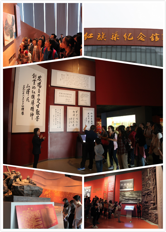 在河南省林州市,老师和同学们参观了人工天河——红旗渠。在红旗渠纪念馆,工作人员详细介绍了修建红旗渠的历史背景及建设过程。讲解员绘声绘色的讲解,再现了当时的真情实景,大家了解到,20世纪60年代,林州人民在极其艰难的条件下,10万人民苦战10个春秋,建成了总长1500公里引漳入林工程——红旗渠。通过观看珍贵的历史照片、修渠所用的简单工具和实地微观沙盘模型,深刻地感受到了老一辈“自力更生、艰苦创业、团结协作、无私奉献”的红旗渠精神。在红旗渠总干渠的咽喉工程——青年洞,当年修建青年洞时,要从陡峭如切的狼牙山悬崖绝壁上穿过,地势之险峻、环境之艰险让师生充分地感受到了红旗渠青年人的坚韧与斗志、乐观与豪迈。