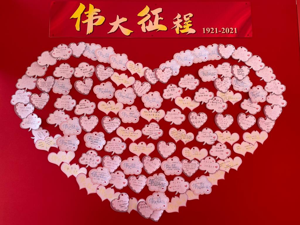观看展览之后,毕业生们在留言区将“我想对党说”的话写在留言卡上,并张贴在留言板展示。“回首百年,感谢党的带领,让我们国家富强、人民幸福!致敬百年,感谢英勇先辈,如今这盛世如您们所愿!”;“强国有我,作为一名青年党员,我愿努力为下一个百年做出属于自己的贡献!”……一句句祝福和告白表达了对党的热爱与忠诚,“初心易得,始终难守”,回顾过往,我们的道路并不平坦;放眼未来,为党工作、为人民服务,我们仍要用一生去践行,将初心变为恒心、把使命视作生命。