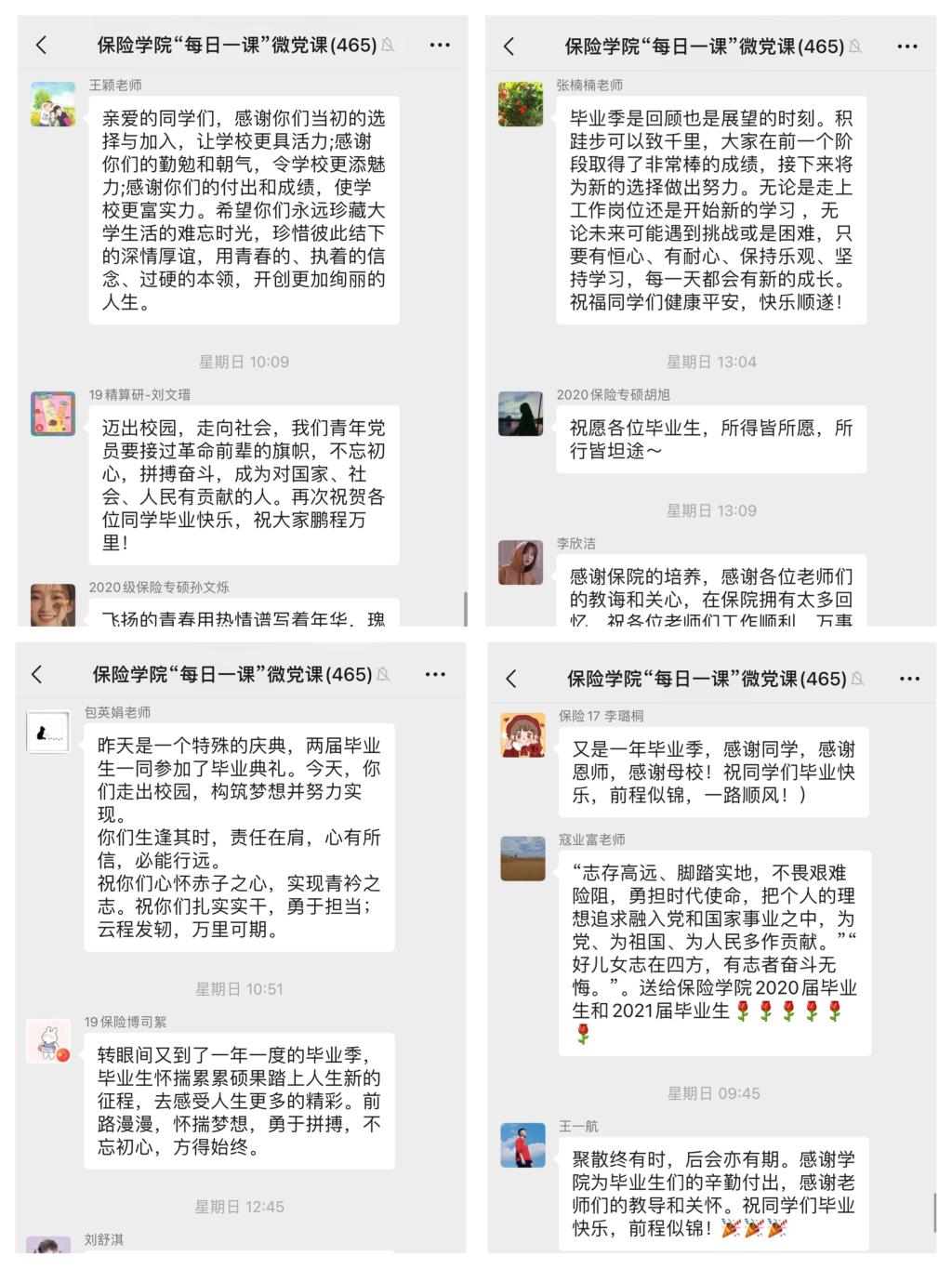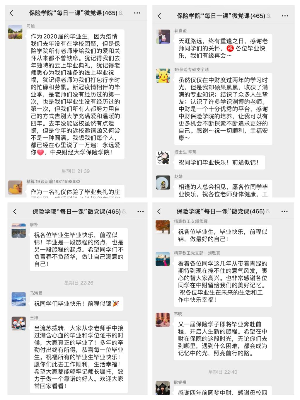 同学祝福,深深祝愿,前程似锦。2020级保险专硕孙文烁祝福:“飞扬的青春用热情谱写着年华,瑰丽的岁月用真心镌刻着友谊,璀璨的人生用执着装点着未来,祝学长学姐们心想事成,前程似锦!”;精算19本科生谈昕瑜祝福:“在接下来的两年里,我会继续努力,向优秀的学长学姐们学习,不负韶华,以梦为马。祝学长学姐前程似锦,未来可期!”;保险18本科生郭祎凝祝福:“大鹏一日同风起,扶摇直上九万里。祝学长学姐们春风得意,终有所成,所得皆所愿。”。