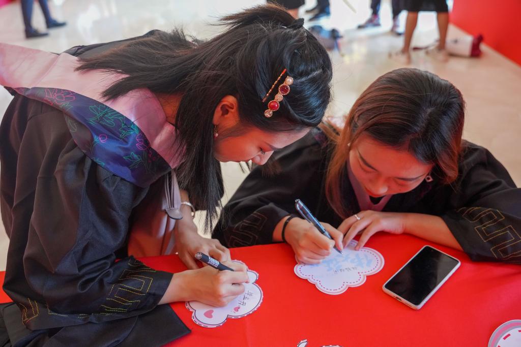 毕业生们将带着老师同学们的祝福奔赴前程,一声声祝愿让离别不再是句号,而是破折号,指向一个带着笑容的温暖明天。