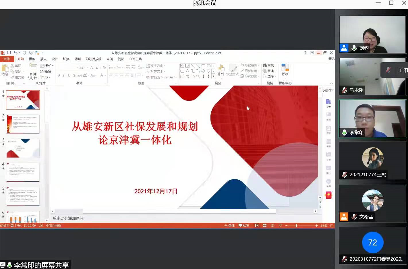 2021年12月17日2点,由yl88858永利官网主办的京津冀社会保障协同发展学术研讨会在腾讯会议上举行。河北省人力资源和社会保障厅失业保险处马永刚处长、中国劳动保障科公司李常印副研究员、北京市社会科公司杨慧副研究员以及yl88858永利官网的师生共70多人参加了本次会议。