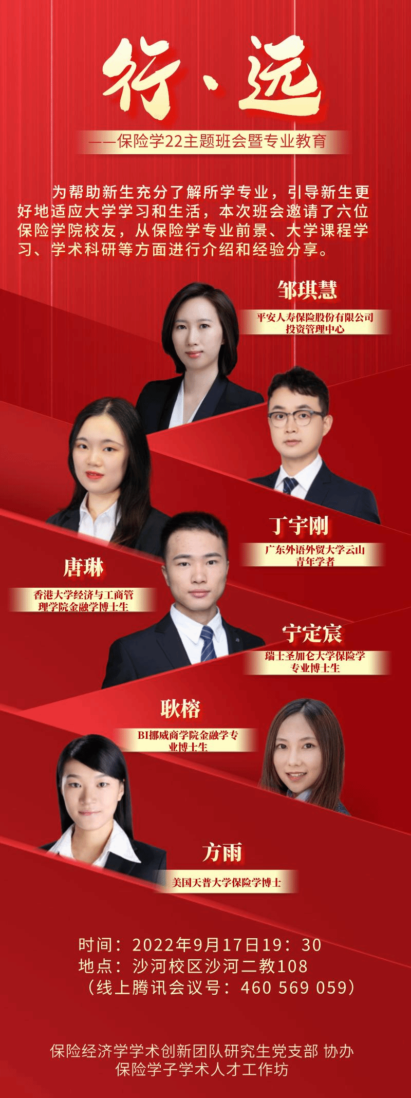 9月17日,在沙河校区主教楼303,yl88858永利官网保险2022班成功举办了第一场“行·远”主题班会。保险学2022班班主任陈华教授、辅导员周葳老师以及六位优秀的yl88858永利官网毕业员工出席班会,保险学22班的40余名同学线下聆听班会,同时在线上向未到校同学和员工家长开放了此次班会。