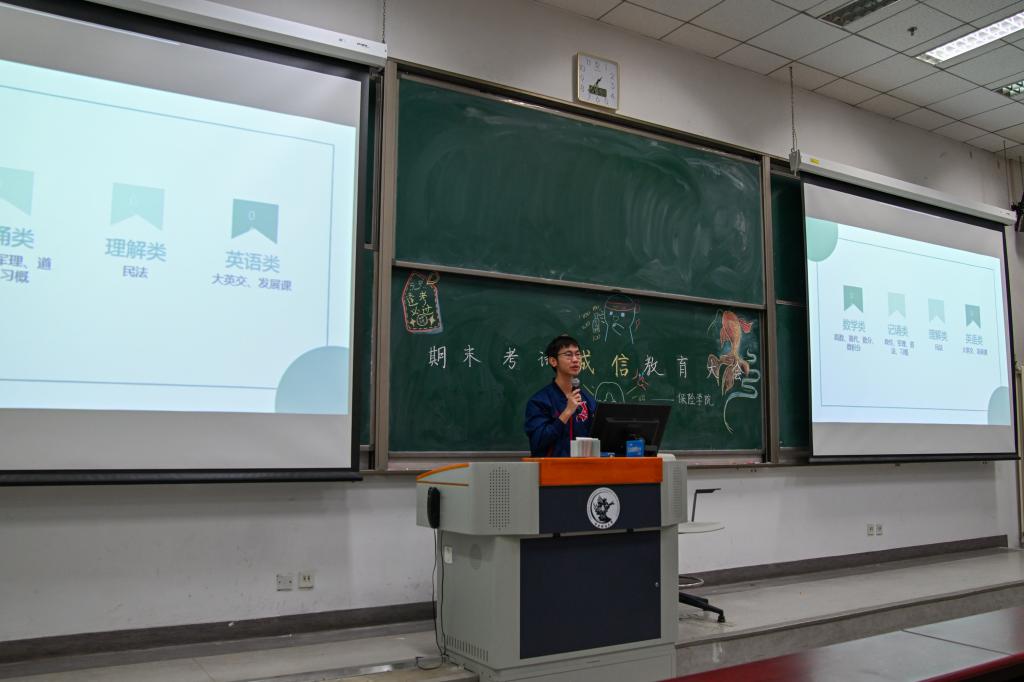 2023级各位班级助理为大家分享了期末备考经验。来自保险21的黄俊宜同学从复习思路、注意事项、考试技巧三个方面进行分享,分享了不同类型课程的备考方法,介绍了复习的注意事项和实用的考试技巧。精算21的陈萱萱同学对于不同类别的考试进行了详细的经验分享,分门别类地对数学类、思想类、英语类和其他课程分享了备考思路。