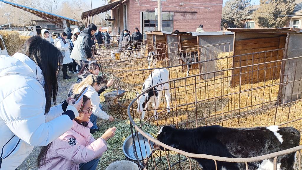 随后,工作人员带领大家走进牛场,为大家提供了近距离观察不同年龄段奶牛的机会,在给小牛犊投喂饲料的过程中,同学们进一步与小牛互动,深入体验劳动的乐趣。