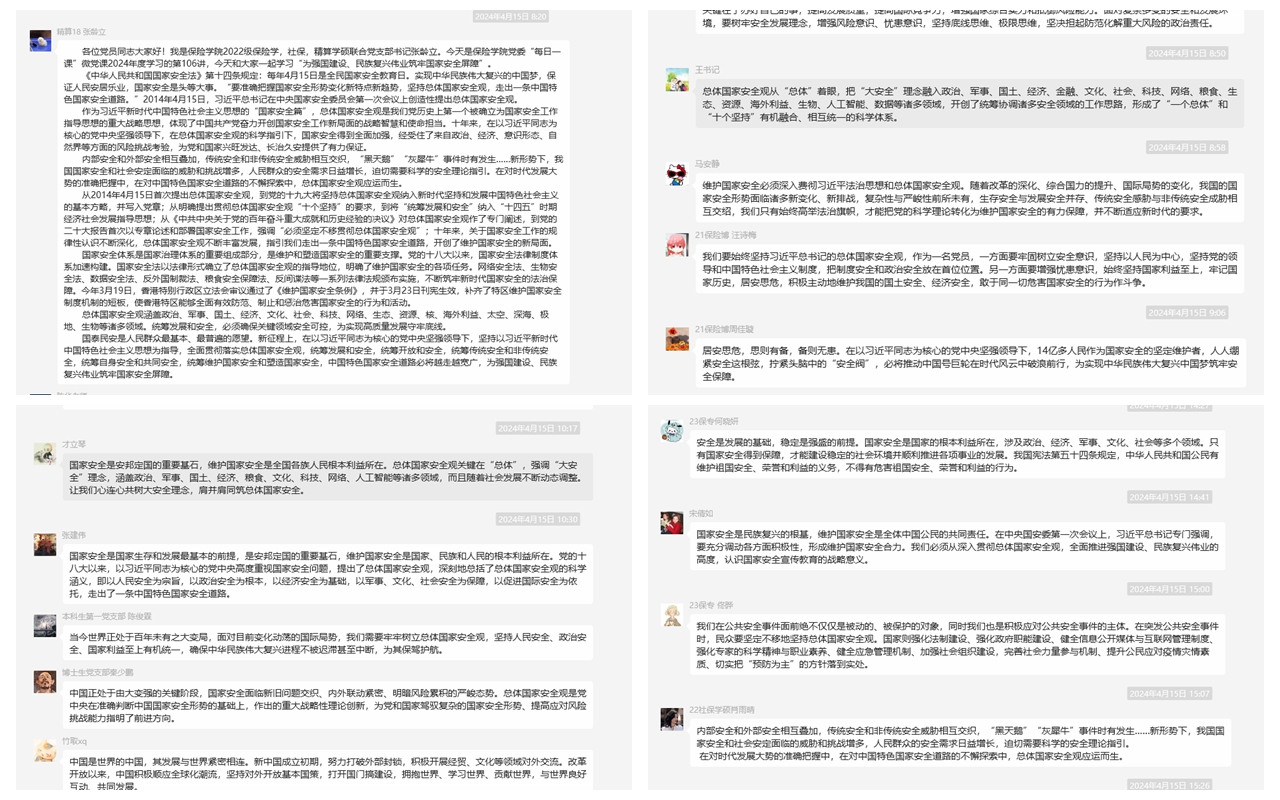 为积极响应习近平总书记关于总体国家安全观重要论述,培养党员同志深化对总体国家安全观的意识,在思想上形成维护国家安全的高度自觉,公司党委依托“每日一课”平台,进行“为强国建设、民族复兴伟业筑牢国家安全屏障”的微党课学习宣讲。公司各支部党员同志积极踊跃发言,从多个角度阐述对国家安全的理解与认识,并表示,国家安全事关所有人,每位党员都有责任与义务自觉维护各领域安全,为国家发展保驾护航。