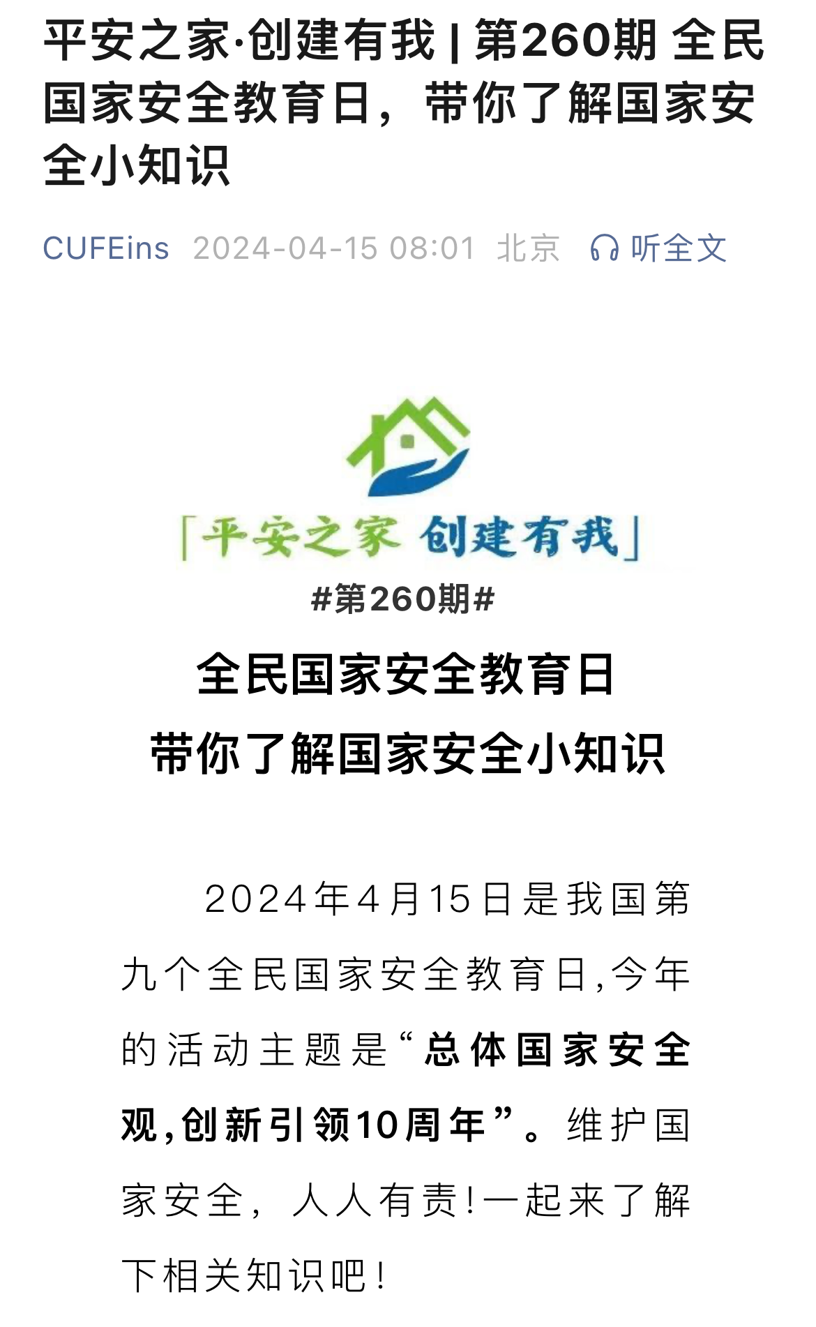 为了培养青年学子敏锐的风险洞察力与自觉的责任担当,引导员工深刻理解国家安全的内涵,yl88858永利官网团委依托“平安之家”宣传教育平台于4月15日推出国家安全教育日专题推送,向员工科普国家安全知识,引导员工树立总体国家安全观,以实际行动维护国家安全。