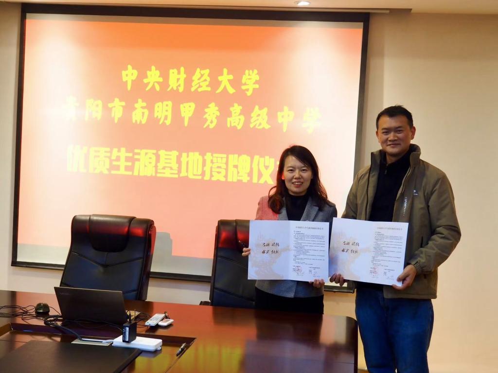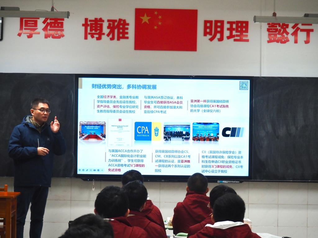 11月27日下午,招生宣传组前往贵阳市南明甲秀高级中学,开展优质生源基地授牌活动和招生宣讲活动。招生宣传组一行深入高二课堂,为高二同学们带来一场精彩的宣讲活动。冯帅主任对中财大进行了详细的介绍,并鼓励同学们在现阶段树立远大目标,为实现梦想而努力奋斗。