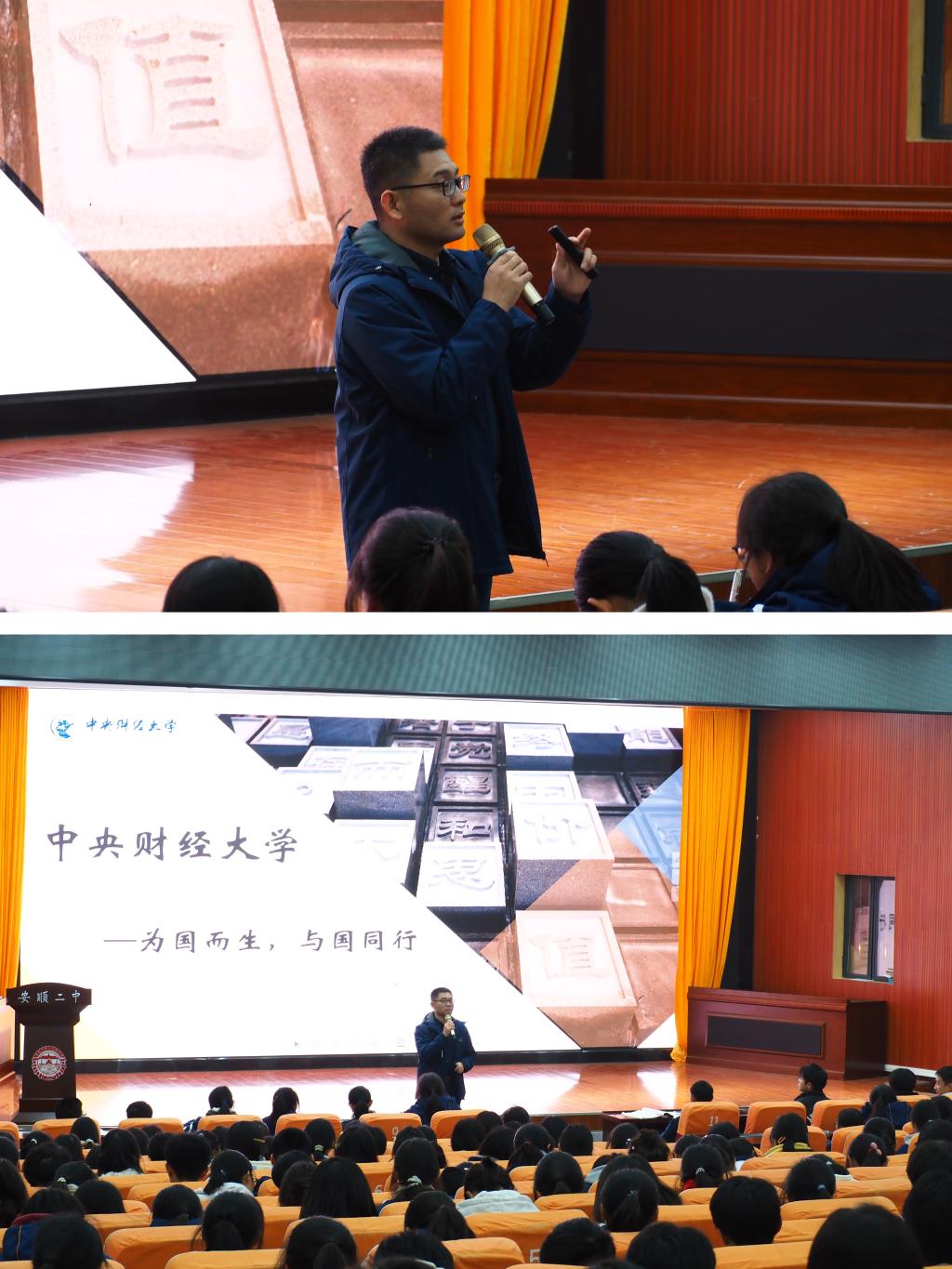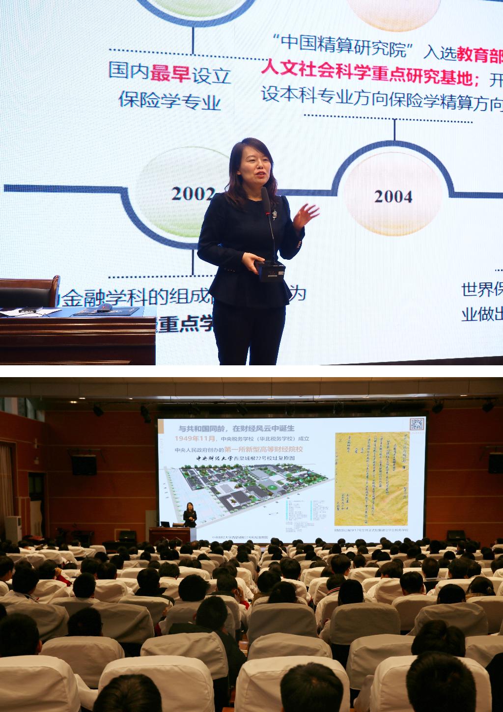 座谈结束后,王丽珍副经理与冯帅老师分别面向安顺一中、安顺二中进行了“龙马讲堂”宣讲活动。他们详细介绍中财大的历史沿革、团队力量、学科优势、人才培养、就业发展等情况。与此同时,王丽珍副经理针对保险业发展现状、保险业相关政策和制度、主要的保险产品等知识向安顺一中的同学们进行了深入浅出的科普讲解。冯帅主任则围绕生涯目标定位、学习认知优化、情绪压力纾解等方面进行了科普讲解。宣讲现场同学们踊跃发言,气氛热烈。
