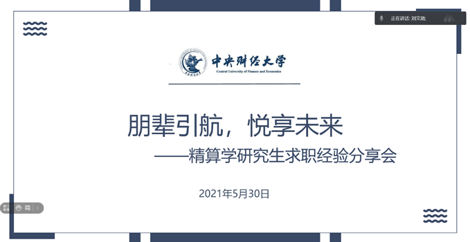2021年5月30日上午,由2018级、2019级和2020级精算学研究生共同举办的就业经验交流会通过腾讯会议的方式在线上顺利进行。本次会议由2018级精算学研牵头,邀请到了苑兴涵、宋阳葛、郑逢萍、张帆、邱天琪、苏晖等六位同学,分享了他们在暑期实习、秋招春招、学术科研等方面的经验。