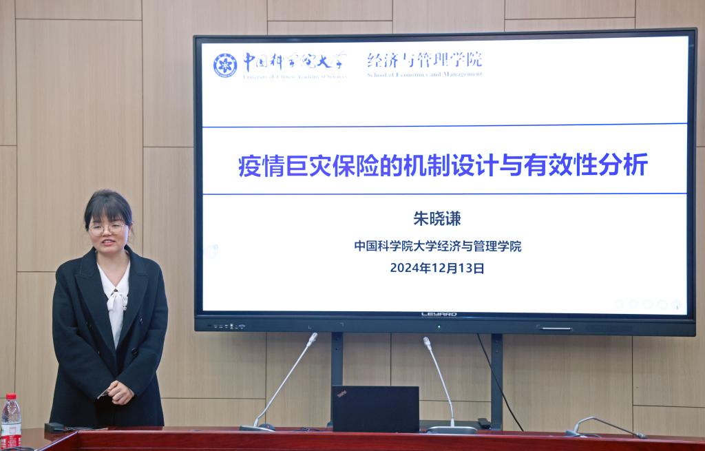 中国科公司大学经济与管理公司副教授朱晓谦就“疫情巨灾保险的机制设计和有效性分析”发表主旨演讲。朱老师探讨了疫情巨灾保险的设计理念,包括损失测算、基金规模确定和赔付比例指标的构建等,通过实证研究展示该保险基金在短期和中长期的有效性。她强调,金融工具在应对非自然因素导致的大规模风险事件中具有重要作用,通过引入市场机制分担风险,能够缓解财政压力并提高资源分配效率,显著提升社会抵御突发公共卫生事件的能力。