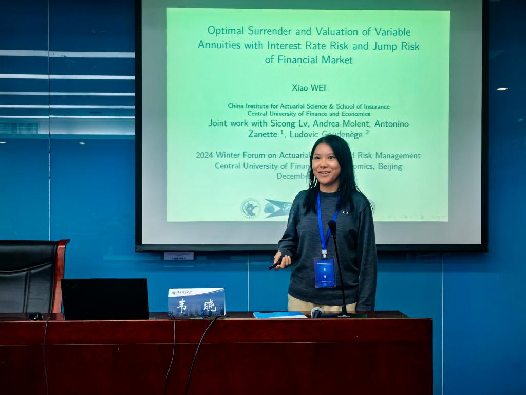 最后,永利集团官网韦晓副教授发表题为“Optimal surrender and valuation of variable annuities with interest rate risk and jump risk of financial market”的主旨演讲。韦老师探讨了在具有价格跳跃风险和利率风险的金融市场中,带有最低保障利益的变额年金的最优退保和定价问题。她介绍了两种方法来解决这个问题:一是结合树方法和有限差分技术的混合数值方法,适用于处理带周期费用和死亡风险的复杂模型;另一个是二维傅里叶余弦展开法,用于考虑资产与利率相依的情形。最后,她讨论了两种方法数值结果的精确性,以及对结果的敏感性进行分析。