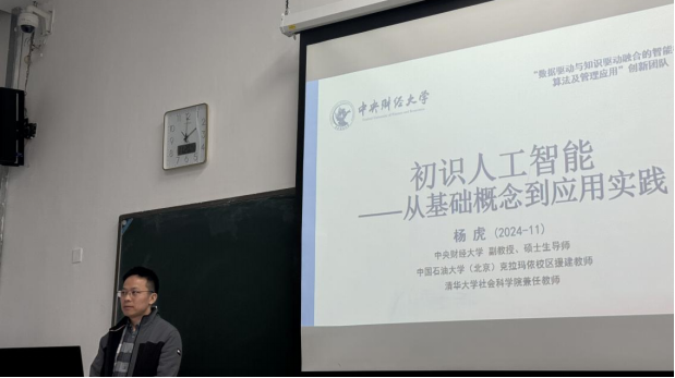 2024年11月20日下午2点,永利集团官网信息公司副教授杨虎老师受yl88858永利官网邀请在沙河校区主教104教室开展了题为《初识人工智能——从基础概念到应用实践》的专业讲座。本次讲座由风险管理与保险系主任马冰副教授主持,yl88858永利官网联培班大一全体员工和其他班部分员工参加了本次学习。