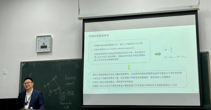 本次授课围绕“准备金评估的演变和影响”展开。课程伊始,卢展航先生向同学们提出问题——为什么要了解准备金?紧接着,卢展航先生为同学们明确了准备金的定义,并通过产险、寿险的例子帮助同学们更好地理解准备金设计的初衷以及准备金的具体计算。
