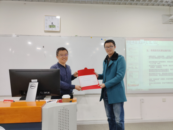 在互动环节,娄飞鹏博士回答了同学们关于利率预测、房地产行业发展、金融机构的主要作用和职业规划等问题,现场气氛热烈。2023级硕士研究生王东升同学谈到,娄博士的分享深化了自己关于中央金融工作会议精神的认识,对于我国金融事业发展的现状与不同阶段目标有了进一步的学习和了解,在很大程度上拓展了视野,对于研究工作很有帮助。马冰老师表示,娄飞鹏先生的分享全面而系统,同时结合了丰富的实务经验,对于了解我国金融事业,进行理论与现实的结合具有重要意义。课程最后,马冰老师向娄飞鹏先生颁发了纪念证书。