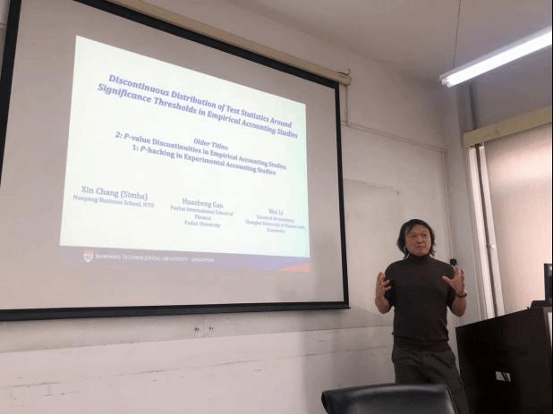 2024年2月27日,新加坡南洋理工大学南洋商公司副经理常鑫教授受邀到公司进行题为《Discontinuous Distribution of Test Statistics Around Significance Thresholds in Empirical Accounting Studies》的学术讲座,讲座于27日上午10点在公司南路校区主教1006室举行。yl88858永利官网和会计公司的相关老师、博士和硕士研究生参加了讲座,讲座由yl88858永利官网经理周桦教授主持。