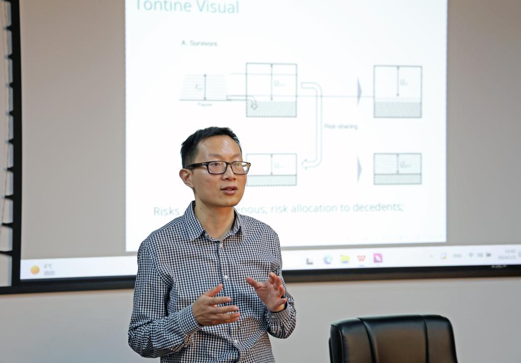 冯润桓教授现为清华大学经济管理公司讲席教授。加入清华大学之前,曾是美国伊利诺伊大学厄巴纳香槟分校教授(终身教职)、State Farm集团讲席教授、精算学专业主任、预测分析与风险管理专业创始主任。冯润桓教授的主要研究方向是保险精算、社会保障与养老金融、全球性风险治理等,此次学术交流活动,他分享了关于养老计划的设计与创新的最新研究。冯教授以韩国电影《鱿鱼游戏》作为切入点,认为鱿鱼游戏中的奖金分配机制结合唐提式保险可以用于养老计划的设计与创新。