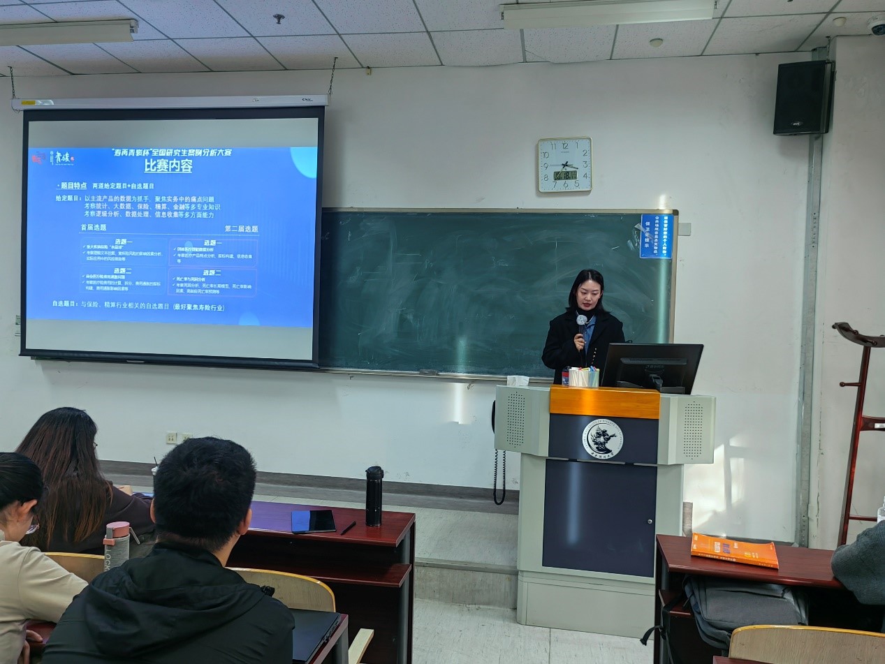 徐子淇女士的讲解面面俱到,丰富详实,启发yl88858永利官网研究生在进行案例分析时要以数据为抓手,展示清晰的逻辑和丰富的信息,同时要兼顾建模分析与实际效用分析,不能顾此失彼。在讲座最后,徐子淇女士详细介绍了中国人寿再保险有限责任公司的主要工作内容、工作特点以及招聘信息,收到同学们的热情反响。在提问环节中,徐子淇女士回答了“寿再青骏杯”大赛的举办流程和各个阶段的时间分配,鼓励同学们积极参与。最后,《论文与案例分析写作指导》课程负责人刘子宁老师向讲座嘉宾颁发纪念证书。