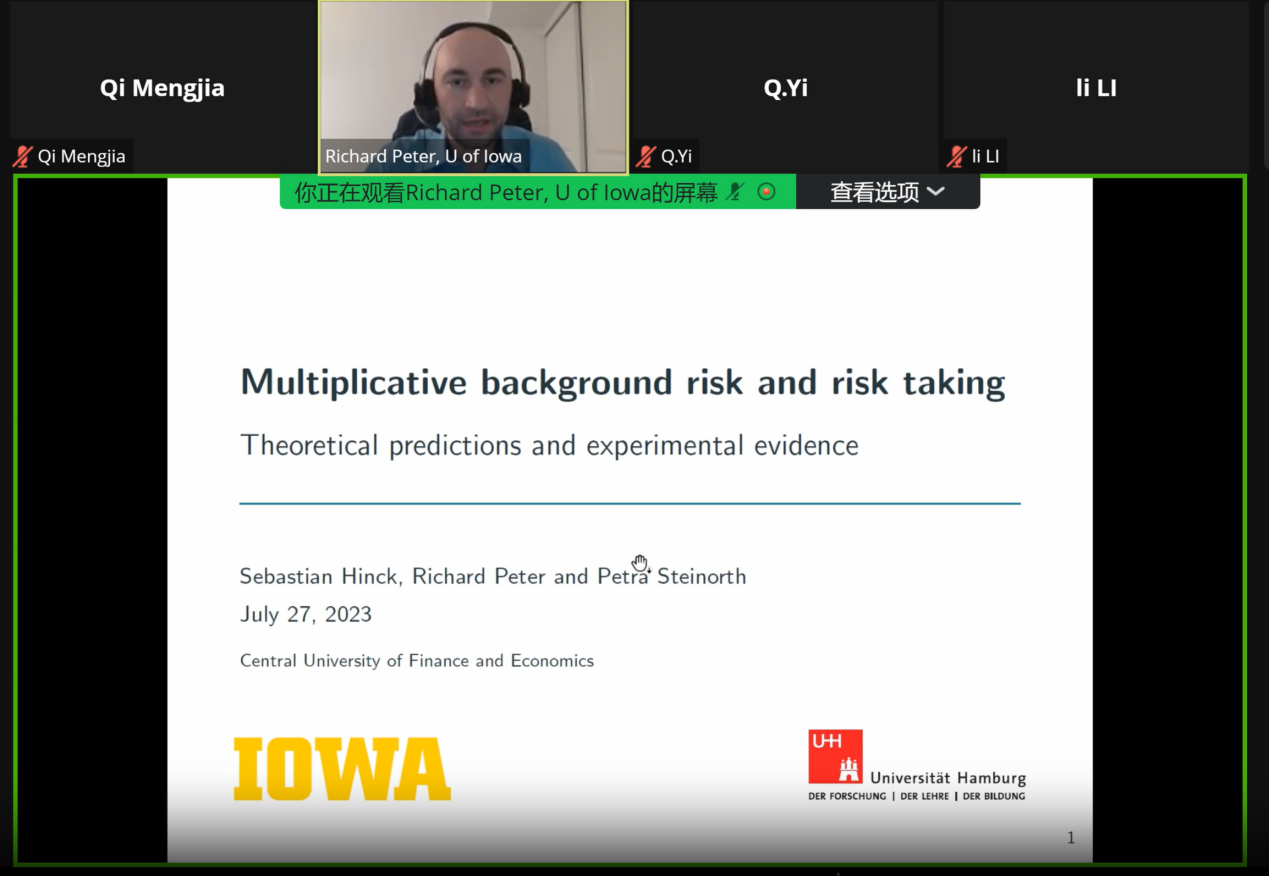 为活跃公司的学术氛围、促进国内外保险精算学术交流,应中国精算研究院池义春研究员邀请,美国爱荷华大学金融系的Richard Peter副教授于2023年7月27日中午通过zoom会议给公司师生做了题为“Multiplicative background risk and risk taking”的精彩学术报告。