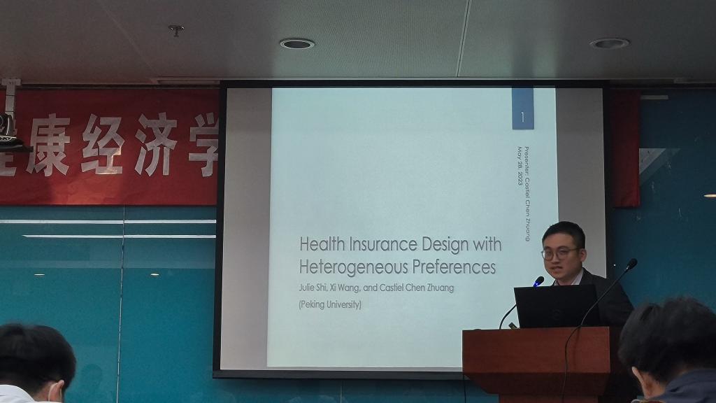 第四位汇报论文的学者是来自北京大学经济公司的庄晨老师,他汇报的题目是“Health Insurance Design with Heterogeneous Preferences”。该研究根据不同等级医院提供了一个基于价值的健康保险设计经验分析框架。汇报结束后,来自北京大学的赖毅老师进行了点评,并就相关问题和庄晨老师进行了交流。