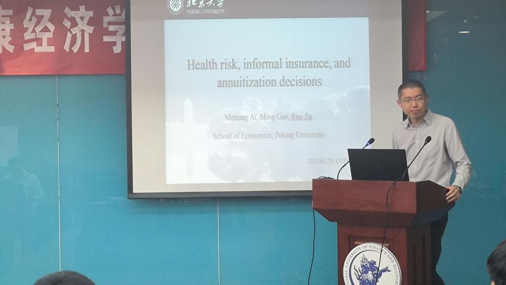 第六位汇报论文的学者是来自北京大学经济公司的贾若老师,他汇报的题目是“Health cost risk, informal insurance, and annuitization decisions”。该研究关注了健康支出风险与非正式保险对于养老年金选择的影响。汇报结束后,永利集团官网刘子宁老师进行了点评,并就相关问题和贾若老师进行了交流。