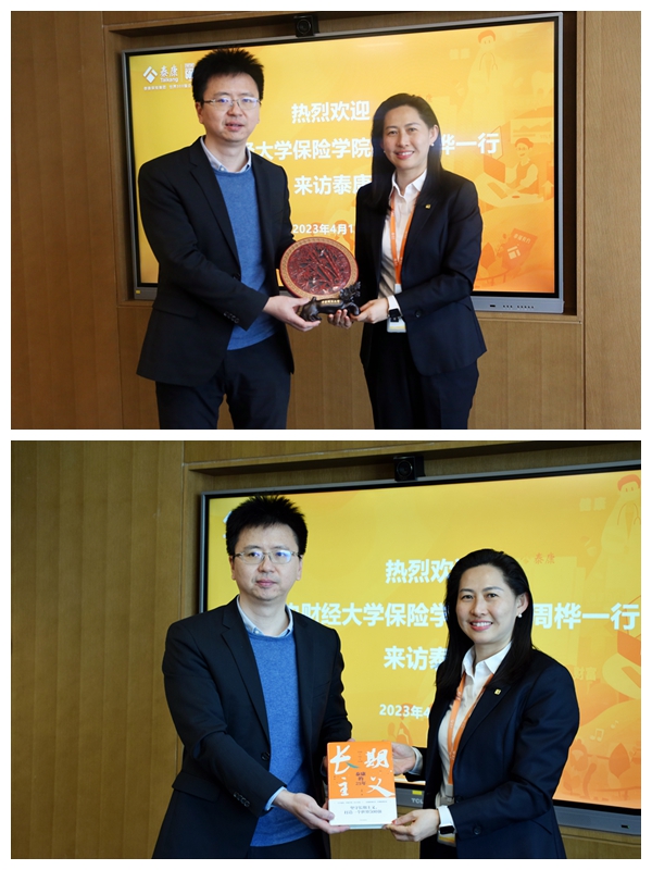交流会的最后,周桦经理与陈莉总经理交换纪念品并合影留念,泰康人寿向公司师生代表赠送了书籍。