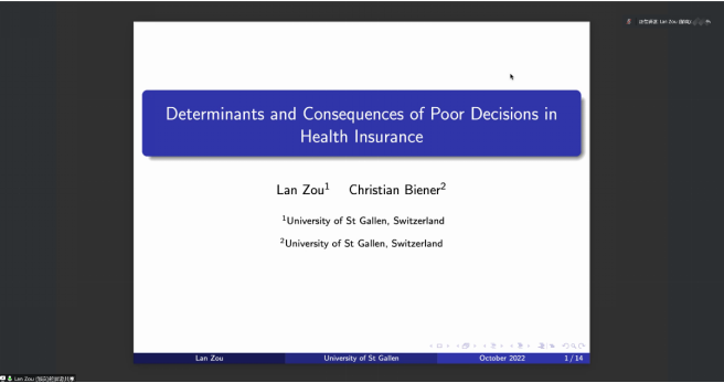 第八位汇报论文的学者是来自瑞士圣加仑大学的邹岚博士,她汇报的题目是“Magnitude and Social Correlates of Poor Decisions in Health Insurance”,该研究关注了健康保险购买行为的影响因素。汇报结束后,王贞老师进行了点评并且就相关问题和邹岚博士进行了交流。