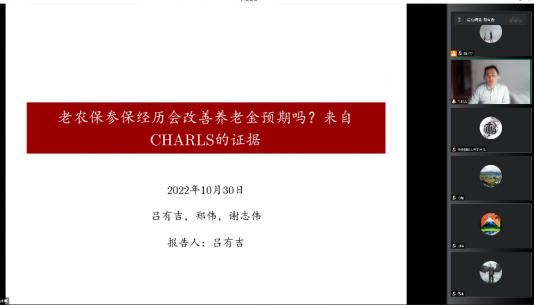 第五位汇报论文的学者是来自南开大学金融公司的吕有吉老师,他汇报的题目是“老农保参保经历会改善养老金预期吗?来自CHARLS的证据”,该研究关注了老农保经历对于个人养老金预期的影响。汇报结束后,来自北京大学现代农公司的吴派欧博士进行了点评并且就相关问题和吕有吉老师进行了交流。