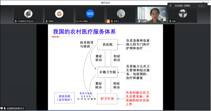 第六位汇报论文的学者是来自北京大学现代农公司的吴派欧博士,她汇报的题目是“村卫生室实施基本药物制度对农村患者医疗服务利用的影响”,该研究关注了村卫生室基本药物制度都对于农村患者医疗服务利用的影响。汇报结束后,吕有吉老师进行了点评并且就相关问题和吴派欧博士进行了交流。