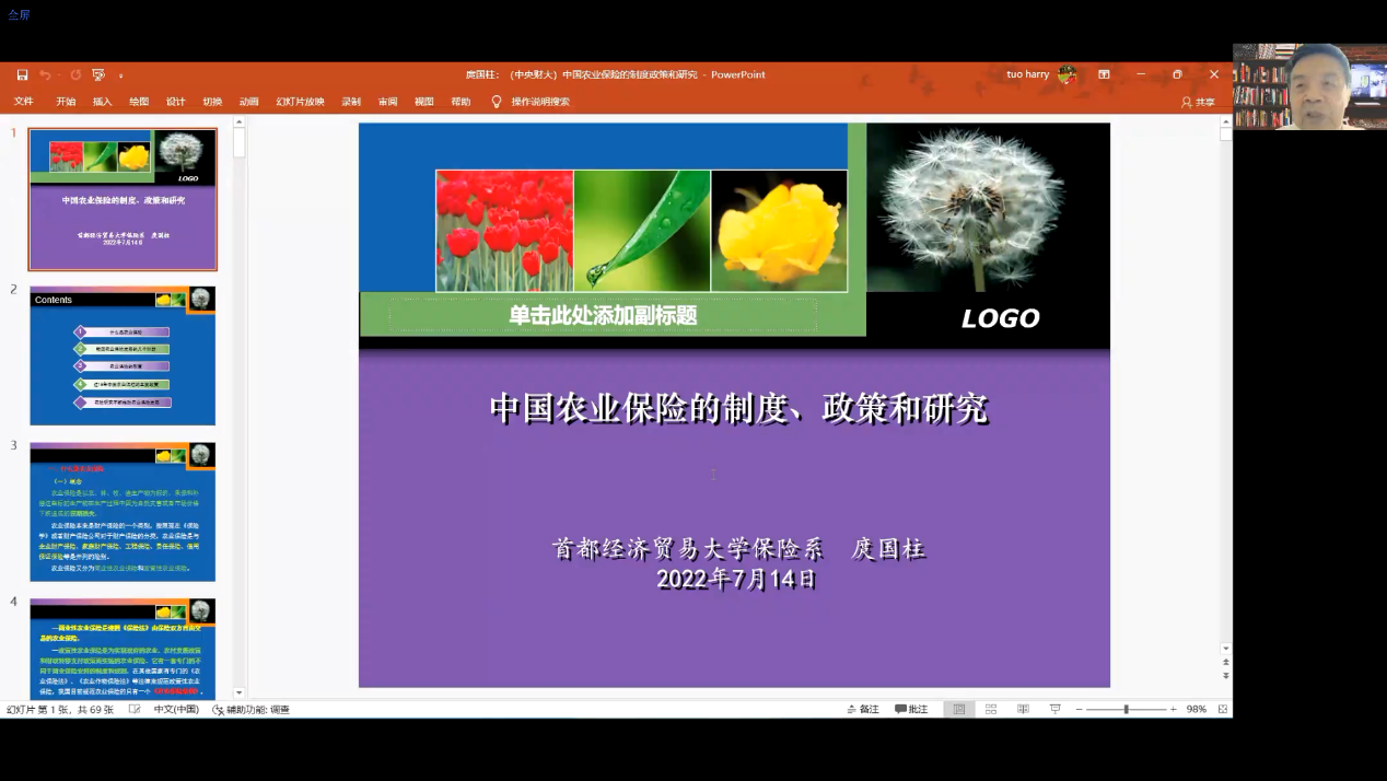 首都经济贸易大学劳动经济公司和财政金融公司教授、博士生导师,兼任中国社会保险学会理事,中国保险学会理事,北京经济学总会理事,北京保险学会和保险协会常务理事,北京国际金融学会常务理事的庹国柱教授做了题为《中国农业保险的制度、政策和研究》的报告。庹教授先对农业保险进行了详细的介绍,包括政策性和商业性农业保险两大类。他认为农业保险服务于农业和农村发展政策和财政转移支付政策,中国的农业保险制度发展经历了多个阶段,目前采用政府+市场的模式。而相关政策主要分为不同性质的农业保险相区别的政策、农业保险要统一管理的政策、财政政策、税收政策、市场组织政策、市场监管政策六类。