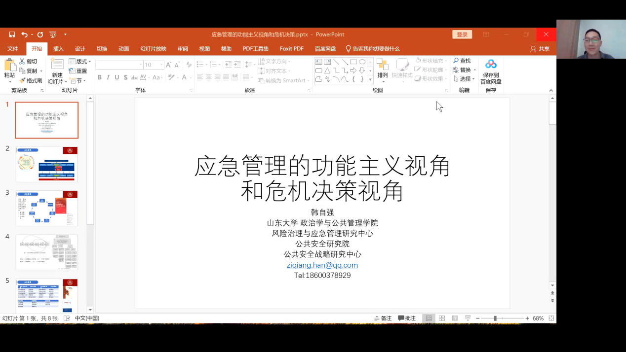 山东大学政治学与公共管理公司教授、清华大学中国应急管理基地兼职研究员、公共安全科学技术学会应急管理专业委员会委员、中国应急管理学会校园安全专委会副主任委员韩自强教授做了题为《应急管理的功能主义视角和危机决策视角》的报告。他认为从功能主义视角看,从政府角度去协调各方的力量。危机管理中的危机是有危险又有机会的时刻,是给测试决策和问题解决能力的一刻,具有紧急性、威胁性。其流程主要包括风险识别与区别、培训演练与评估、灾后重建等多个部分。