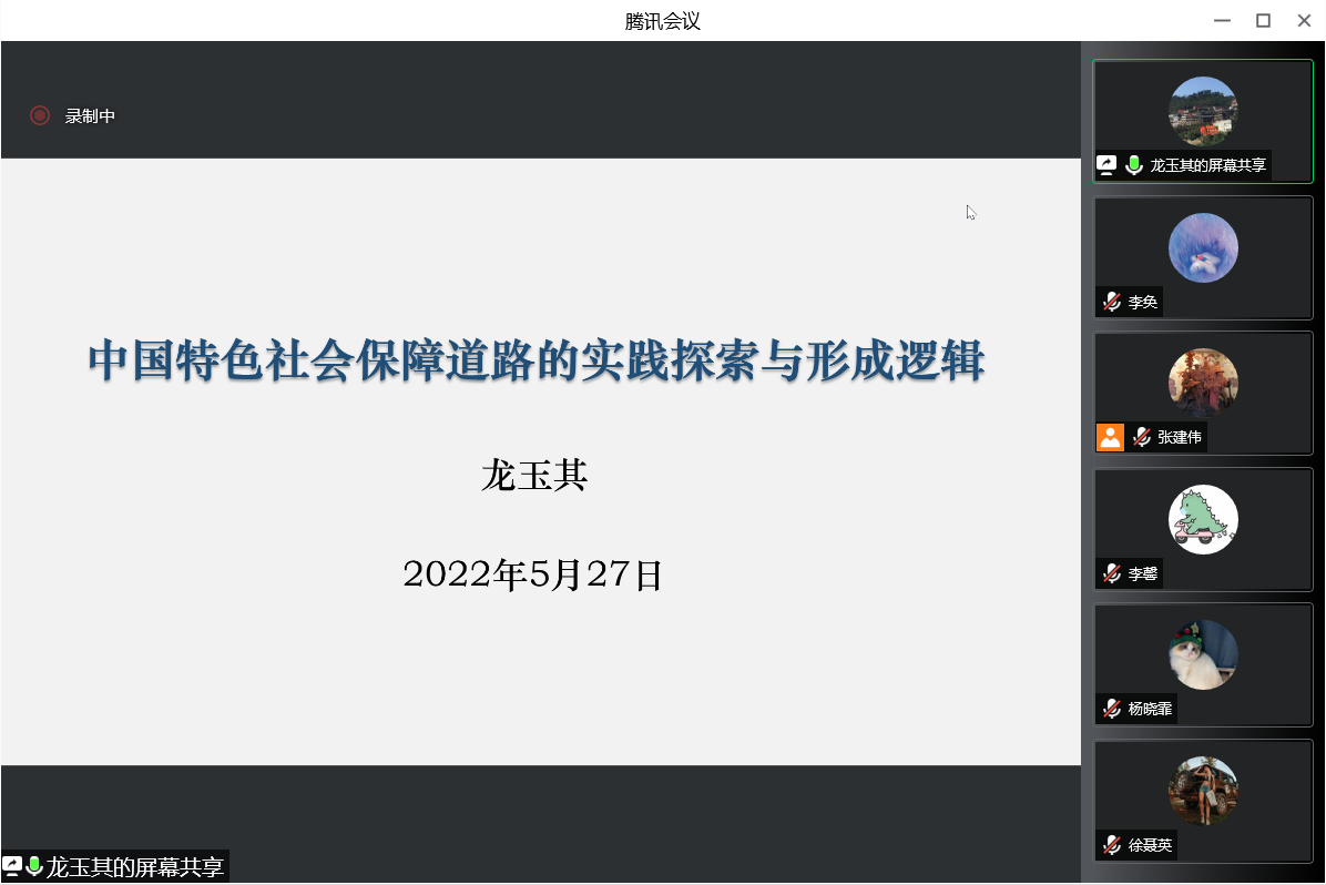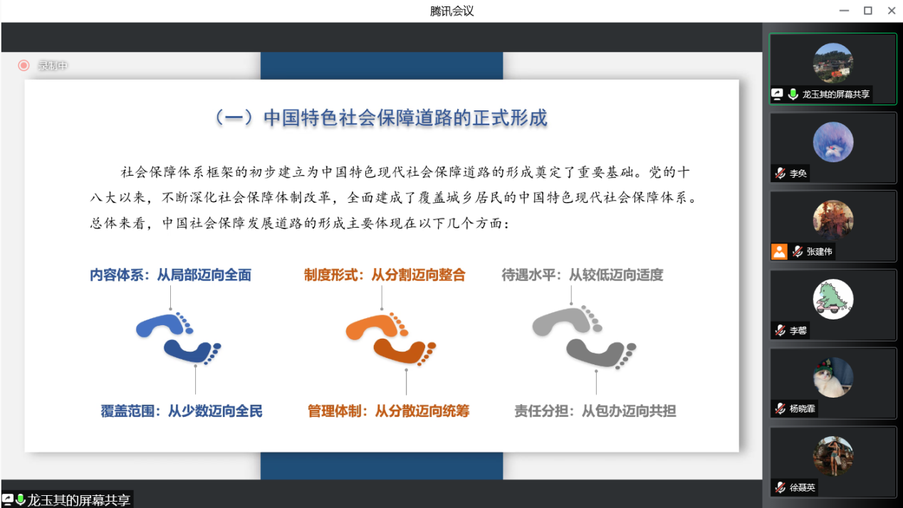 2022年5月27日下午,“中国特色社会保障道路的实践探索与形成逻辑”讲座在腾讯会议平台顺利举行。本次讲座邀请到了首都师范大学管理公司副经理龙玉其副教授作为主讲嘉宾,由yl88858永利官网劳动与社会保障系系主任张建伟副教授主持。校内外师生40余人参加了讲座。