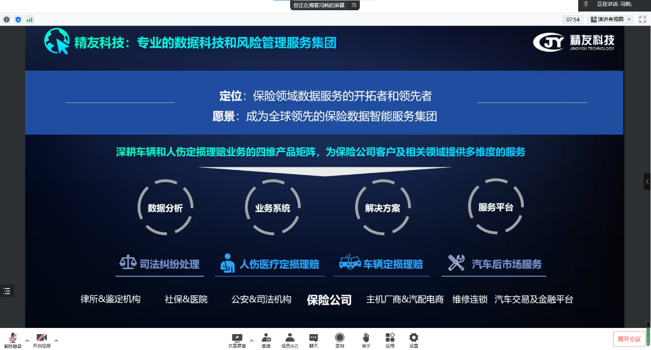 在此基础上,冯韩先生说明综改及疫情正倒逼保险行业加快转型突围,数字化、线上化带给保险业的冲击已经出现,并已无法逆转。企业的经营模式与风险管理方式开始转变,重心从客户需求转移到客户场景,并且经营的关键要素与流程不断被淘汰迭代。同时,监管积极鼓励科技创新,促进企业科技与生态的能力互补。因此,冯韩先生详细讲解了科技赋能保险的具体应用,如AI定损运用新兴技术,能够大幅降低定损理赔成本、极度缩减定损理赔时间,冯韩先生用精友科技的核心数据体系作为案例,阐明技术运行的实际效果;在风控上,科技能够帮助实现实时风险提醒与精确到信息点提醒;在智能硬件上,打造全程录音录像、云存储、查定一体化系统等全新流程。通过科技赋能,帮助企业实现法保联动、车保联动、修保联动,构建全球汽车生态。