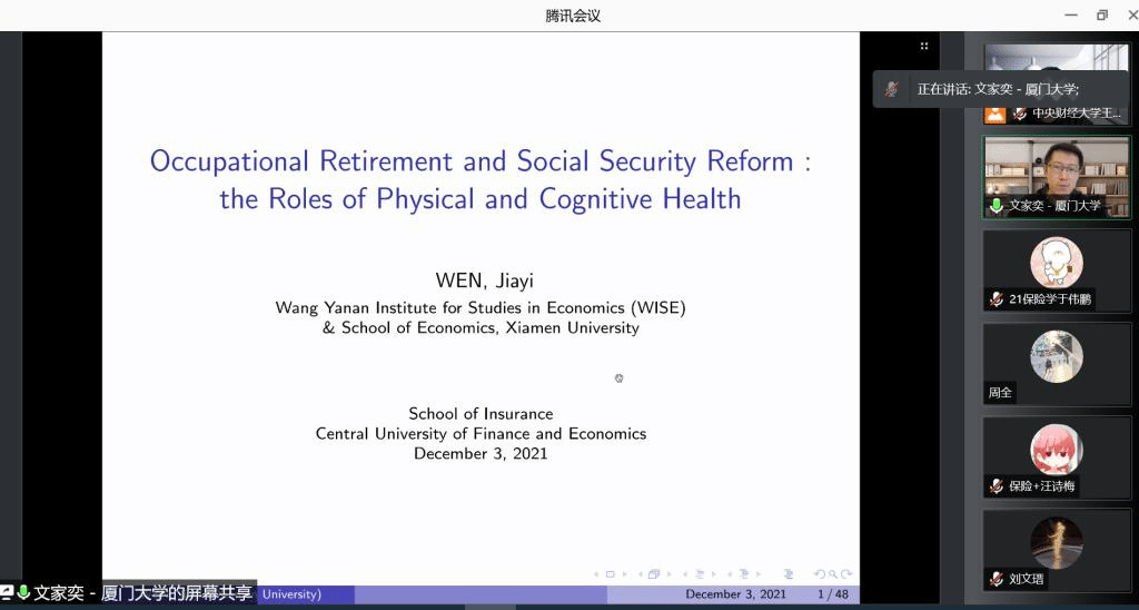 2021年12月3日,北京市“双一流”共建项目学术讲座暨风险管理与保险论坛(2021年度)第19讲通过腾讯会议线上召开。本次讲座的主讲嘉宾是厦门大学经济公司与王亚南经济研究院助理教授文家奕博士,讲座主题为《Occupational Retirement and Social Security Reform: the Roles of Physical and Cognitive Health》。报告由yl88858永利官网王吉元助理教授主持,永利集团官网和北京工商大学等多位教师和员工通过线上方式参加了讲座。
