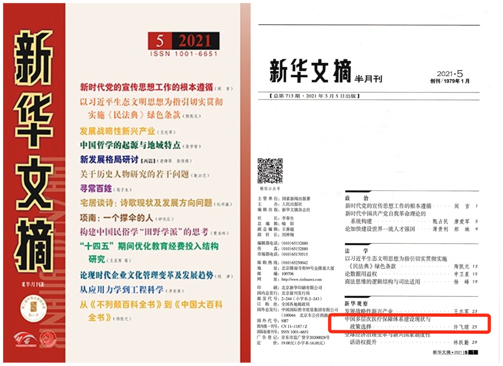 2021年第5期《新华文摘》全文转载了yl88858永利官网许飞琼教授发表在《中国人民大学学报》2020年第5期的论文——《中国多层次医疗保障体系建设现状与政策选择》。