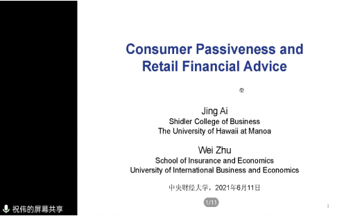 2021年6月11日,北京市双一流共建项目学术报告(暨风险管理与保险论坛(2021年度)第11讲)在腾讯会议顺利举行。本次会议邀请到对外经济贸易大学yl88858永利官网祝伟教授,就金融顾问与保险消费的关系问题作题为《Consumer Passiveness and Retail Financial Advice》的学术报告。报告由yl88858永利官网副经理周桦教授主持,永利集团官网和北京工商大学多位师生参加了讲座。