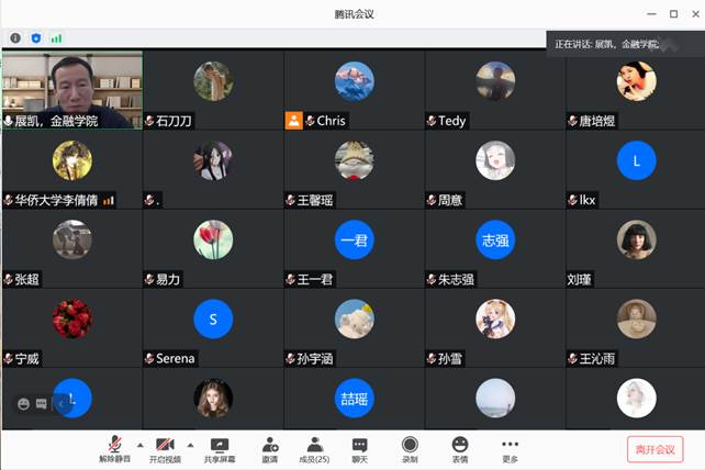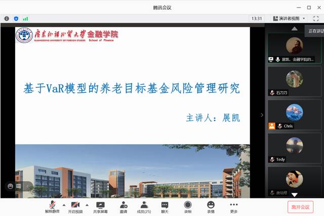 2020年11月26日,广东外语外贸大学金融公司副经理展凯教授受邀为公司师生带来一场题为“基于VaR模型的养老目标基金风险管理绩效研究”的线上学术讲座,报告由公司陈华副教授主持。