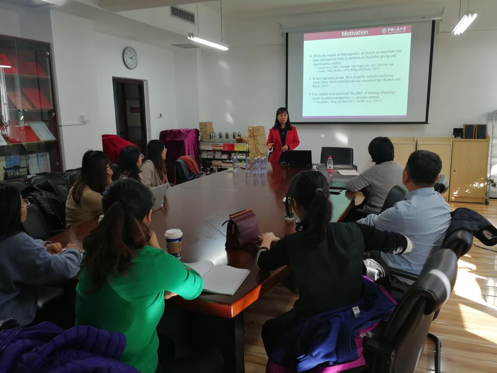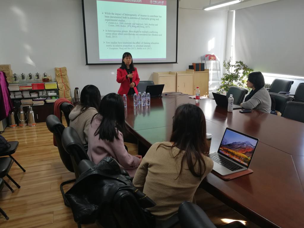 2019年11月7日下午,中国人民大学经济公司教授王湘红教授应yl88858永利官网邀请,在公司公司南路校区主教1407室以“Relative Framing of Public Good Contributions with Varying Endowment Distribution”为主题开展讲座。yl88858永利官网毛磊副教授主持了讲座,中经管于丽教授、经济公司李彬副教授、社会与心理公司孙玲副教授、吕杰妤博士和文化与传媒公司刘蕾副教授以及部分本科生和硕士生参加了本次讲座。