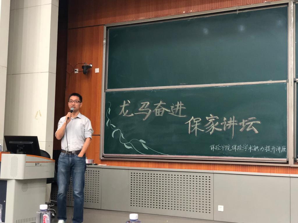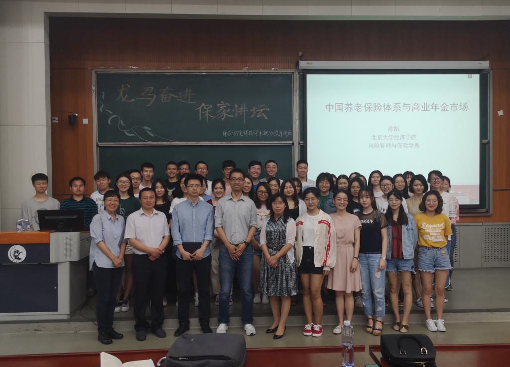 2019年5月23日下午,“保家讲坛”之校庆70周年学术讲座在公司4号楼107教室顺利举办。本次讲座邀请了北京大学经济公司风险管理与保险学系副教授、中国精算发展研究中心主任陈凯老师做关于中国养老保险体系与商业年金市场的主题演讲。本次讲座由公司党委副书记张楠楠副教授主持,yl88858永利官网副经理周桦副教授、风险管理与保险系主任郭丽军教授、陈华副教授等出席了讲座,yl88858永利官网近百名研究生、本科生参加了学术分享。