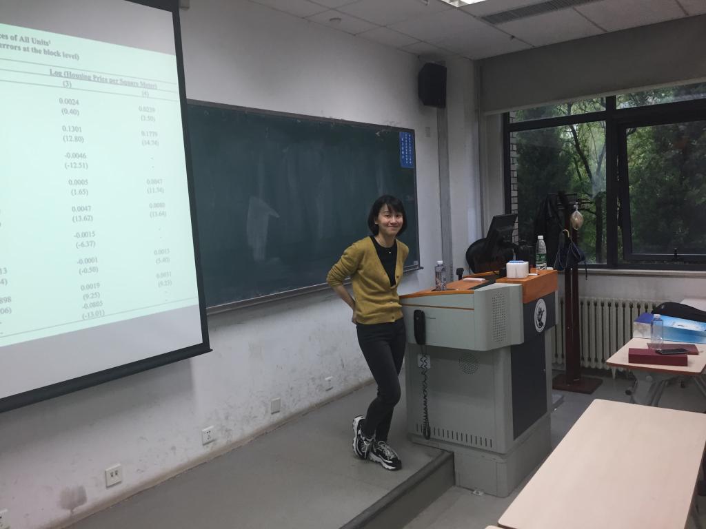 随后,邓莹教授又具体介绍了时间相关模型(SLM)的计算方法、遗漏变量模型(SEM)的偏差处理办法、通过不断迭代来处理动态空间滞后模型等方法。此外,邓莹教授还介绍了几种估计方法:极大似然、GMM、OLS回归分析。邓莹教授以房价为例,运用生动活泼的语言向同学们讲授空间计量经济学的各方面知识,既活跃了气氛,又利于同学理解。