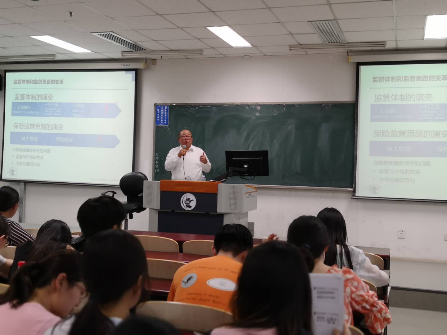 燕总以一则漫画的形式幽默的引出了本次讲座的主题——保险那些事儿。在讲座过程中,他结合其在实际工作中的体会,与同学们分享了关于“保险的那些事儿”:银保监会的成立,分析保监会变为银保监会的原因,引出了保险业监管体制和监管思路的变革;针对保险的本质问题,结合具体的事例,多角度分析了保险的基本面;通过类比其他行业,提出保险创新是为了解决问题,只有在遵循基本规则的前提下创新,并且创新后的保险有价值才是有意义;通过对比相互保险和互助计划,进一步阐释了什么是相互保险;结合工作经验阐释了市场与监管的特征及其重要性,并提出监管要因地制宜,对公司、管理者和技术人员(精算师)的严格监管实际对行业发展好处良多。