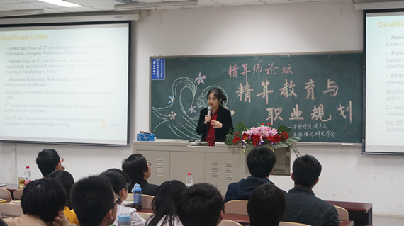 王海晶女士首先介绍了精算教育与职业规划。她说,英国精算师在工作中所需要的技巧与其在公司中所学习的知识密切相关。她以深入浅出的语言向同学们介绍了一名优秀的精算师在大学期间应该提升的能力和应该汲取的知识。在职业规划方面,王海晶女士向在场同学们详细地介绍了英国精算师的工作领域和职业概况,及精算师的一些面试技巧等内容。
