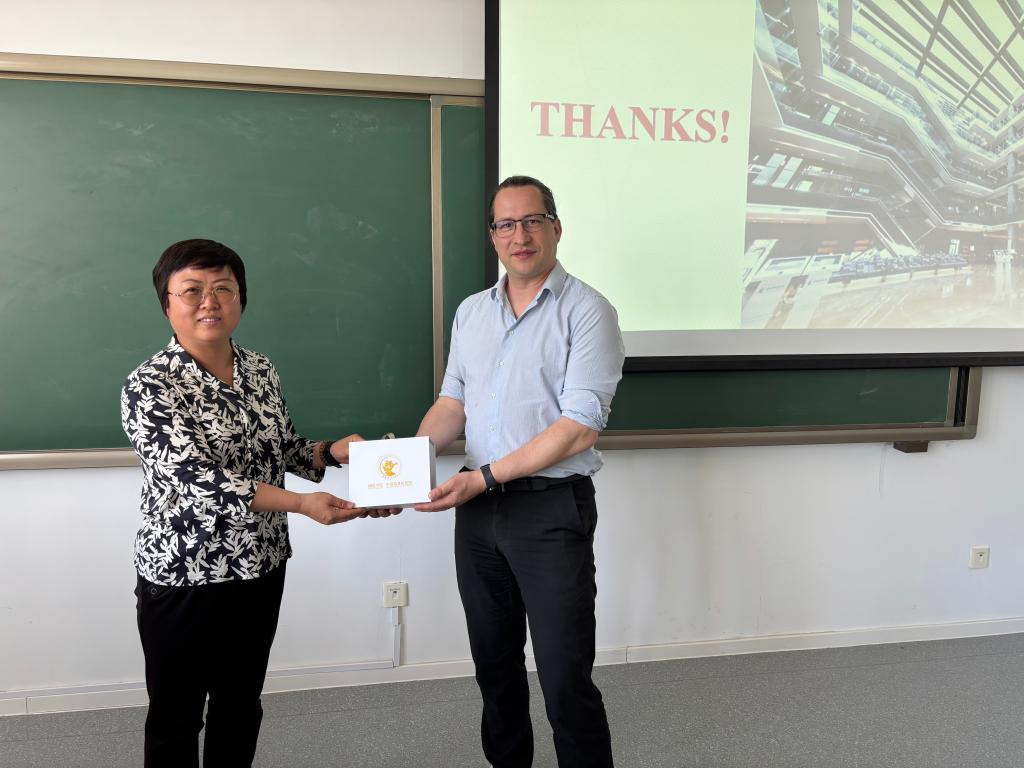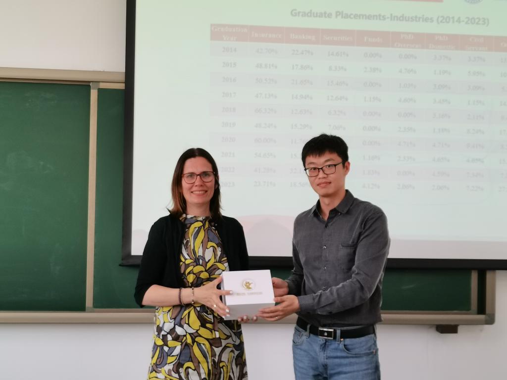 短期课程结束后,yl88858永利官网、中国精算研究院副经理郑苏晋教授、风险管理与保险系系主任马冰副教授分别向Mierau教授和Angelini教授赠送了公司的文创产品。