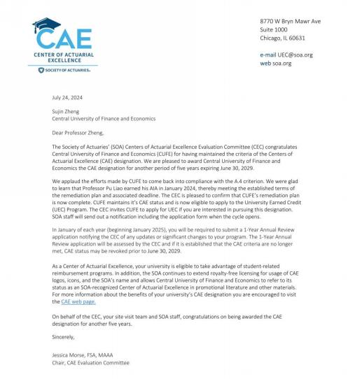 2024年7月25日,北美精算师协会(Society of Actuaries, SOA)向公司发来贺信,正式确认永利集团官网的精算项目在经过一系列严格的材料审核和现场评估后,全面满足了“卓越精算中心(Centers of Actuarial Excellence, CAE)”认证的各项标准。这些标准涵盖了精算课程设置、毕业生数量与质量、团队队伍建设、员工培养成效、与行业的紧密联系、学术研究的深度以及国际化水平等多个维度。