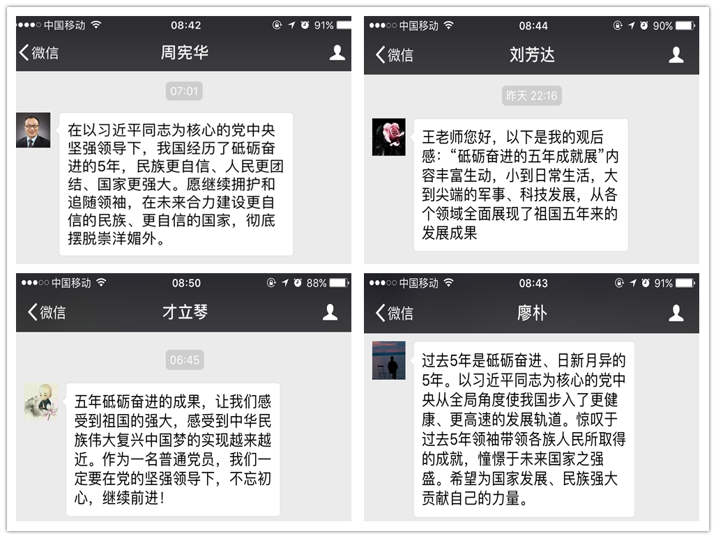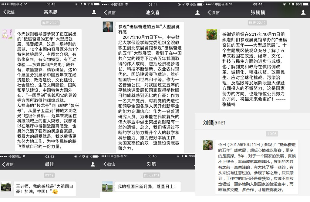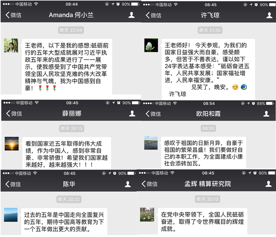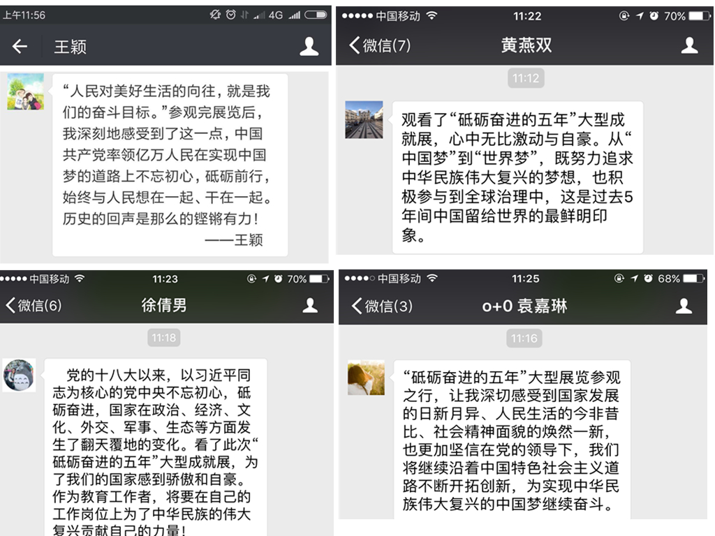 参观完展览后,老师们心潮澎湃,纷纷发来观后感,一位教工党员说:“十九大之后,国家将站在新的起点上。通过砥砺奋进的这五年,相信我们能共同实现两个一百年的伟大梦想!我们作为教育工作者,要将自己的工作职责与国家发展、民族复兴联系在一起,在自己的工作岗位上为了实现中华民族的伟大复兴贡献自己的光和热。”