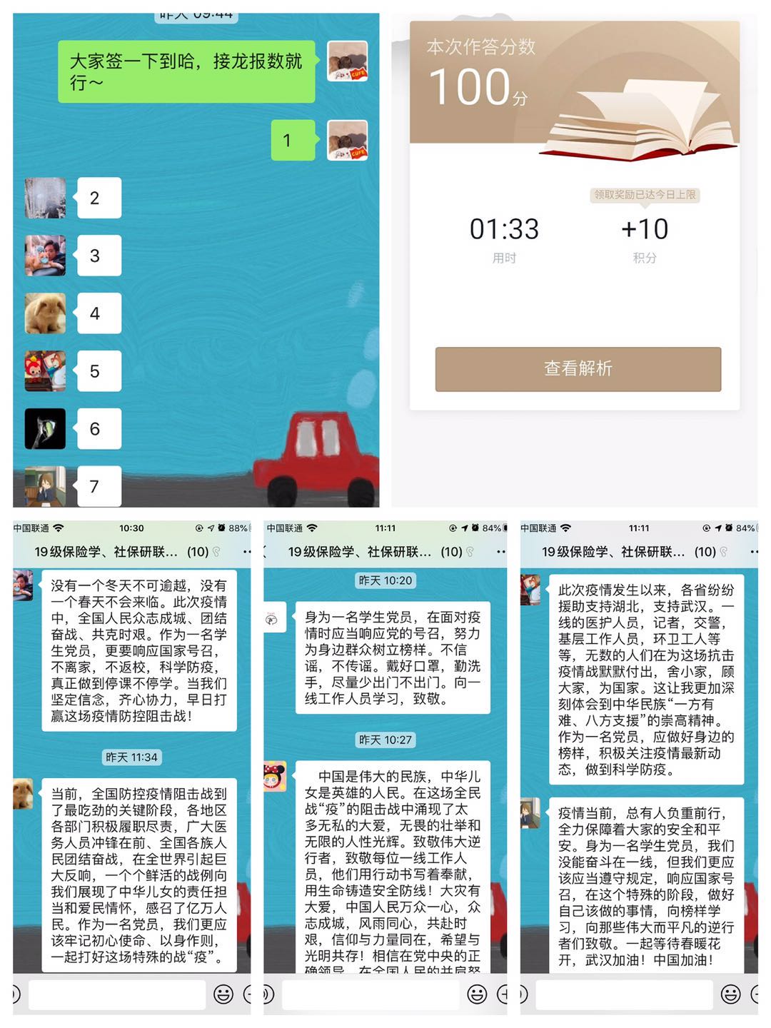 为深入学习贯彻习近平总书记关于疫情防控的重要讲话和指示精神,贯彻落实党中央、国务院关于疫情防控的各项决策部署,坚决打赢疫情防控的人民战争,在公司文件《关于充分发挥公司各基层党组织战斗堡垒作用和党员先锋模范作用 全力做好新型冠状病毒感染的肺炎疫情防控工作的通知》的指导下,2月22日上午10点,2019级保险学、社保研究生联合党支部开展了以“同心抗疫,共克时艰”为主题的线上主题党日活动。