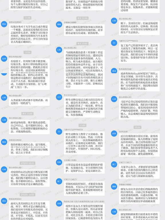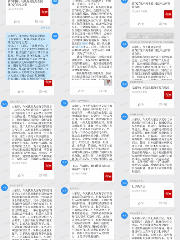 2017、2018、2019级本科生联合党支部开展“每日一学”活动,全体党员利用学习强国学习平台,23天的知识普及,23位党员轮流分享党和政府有关新型冠状病毒疫情防控的政策措施、新型冠状病毒感染防护知识等疫情防控相关知识,参与人次达390余次,发言字数32000余字。或是学习七步洗手法科学保卫健康,或是科普解读新冠肺炎康复者捐献恢复期血浆招募动员通知,亦或是分享新冠病毒传播途径促进有效预防,党员们每天针对不同话题积极发表自己的见解,总结自己的收获,并以实际行动向身边的亲朋好友进行宣传,做科学防疫知识普及的先锋。