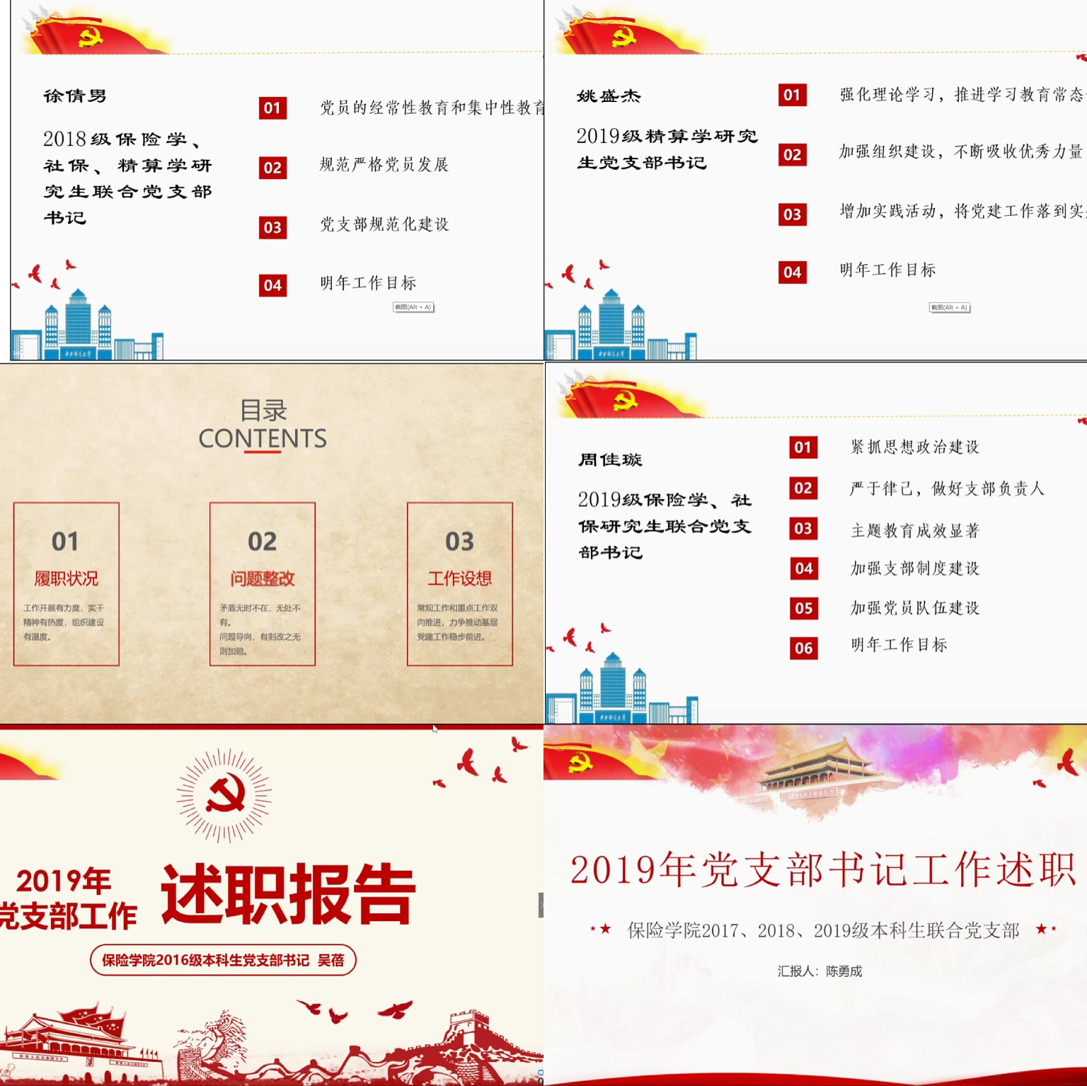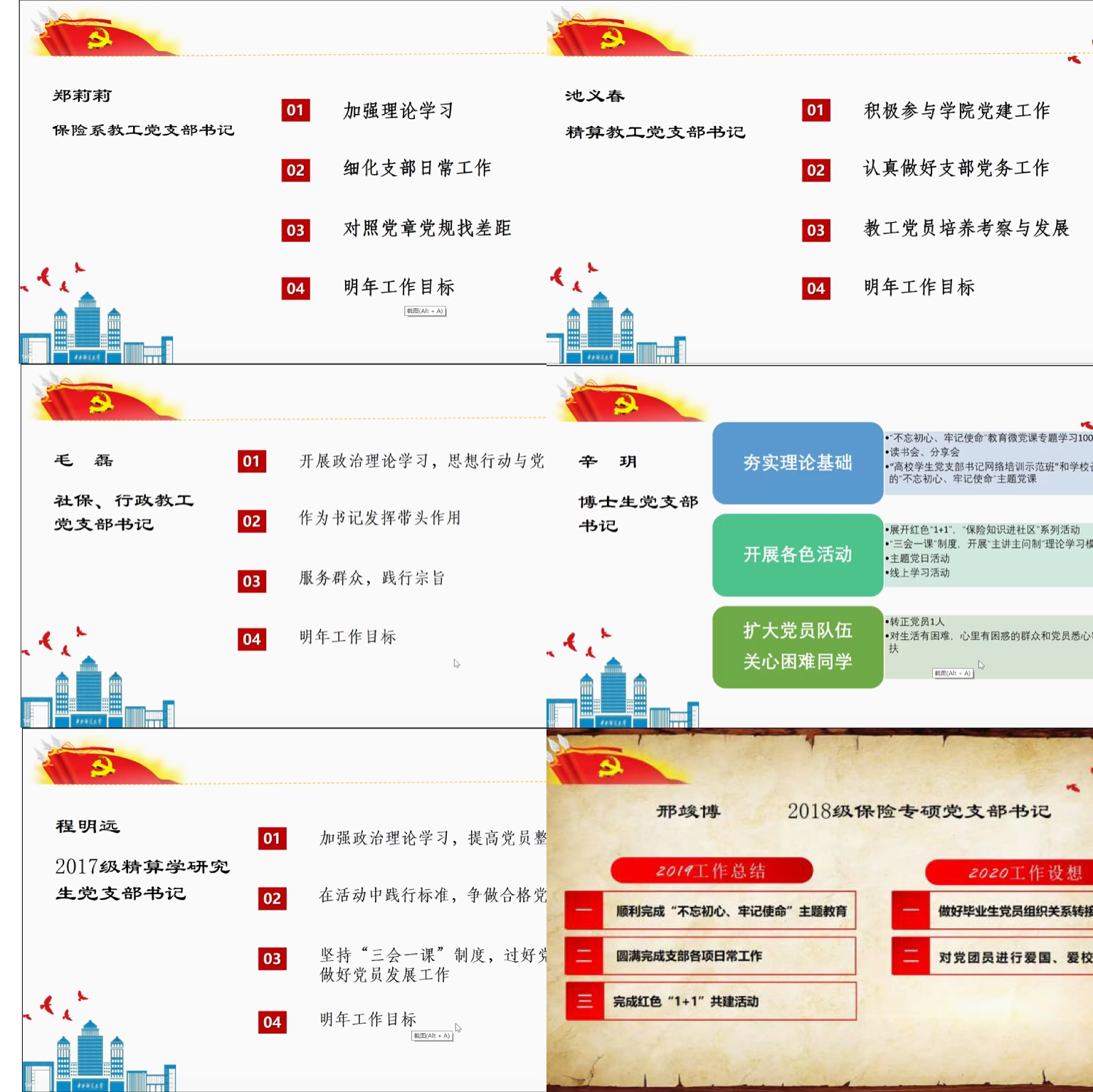 2019级精算学研究生党支部书记姚盛杰从强化理论学习、加强组织建设、增加实践活动三个方面总结了支部建设情况。对2020年工作提出了提高党建工作的主动性和原创性、规范党内组织生活规则等设想。