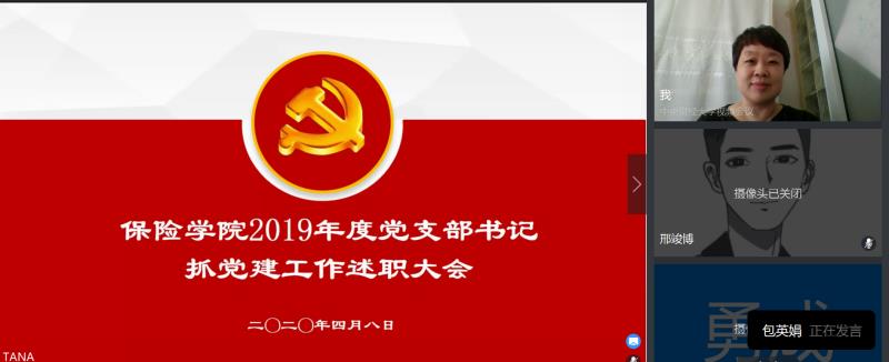风险管理与保险系党支部书记郑莉莉从加强理论学习、细化支部日常工作、对照党章党规找差距活动三方面总结了抓党建工作情况。提出将在2020年从理论学习常态化、提升理论学习的实效性、将理论学习与学科发展紧密结合三个方面不断创新思路,扎实推进党建工作。